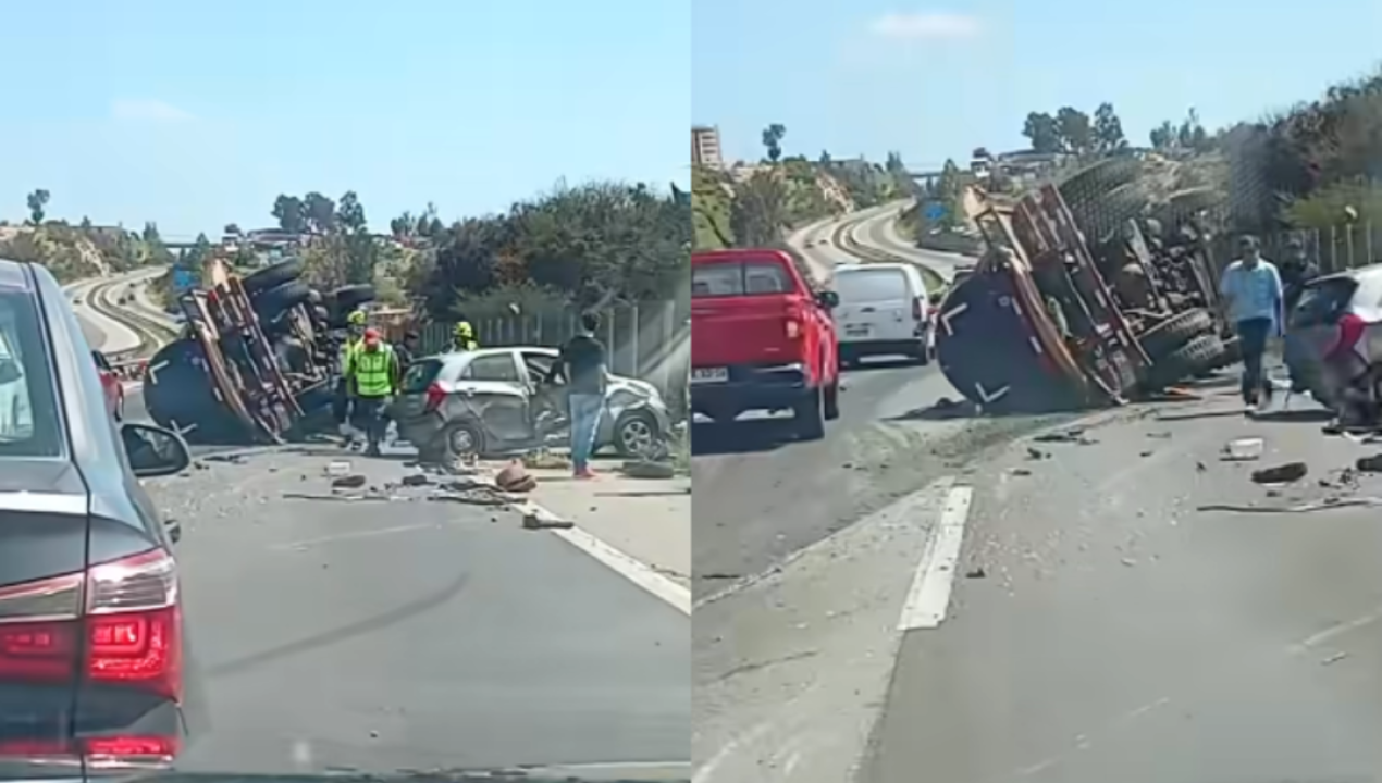 Un volcamiento de un camión séptico se produjo este lunes en la autopista Troncal Sur, a la altura del paso sobre nivel Ramón Ángel Jara, en dirección hacia Quilpué. El vehículo mayor colisionó con un automóvil menor, lo que provocó el derrame de aguas servidas sobre la calzada.